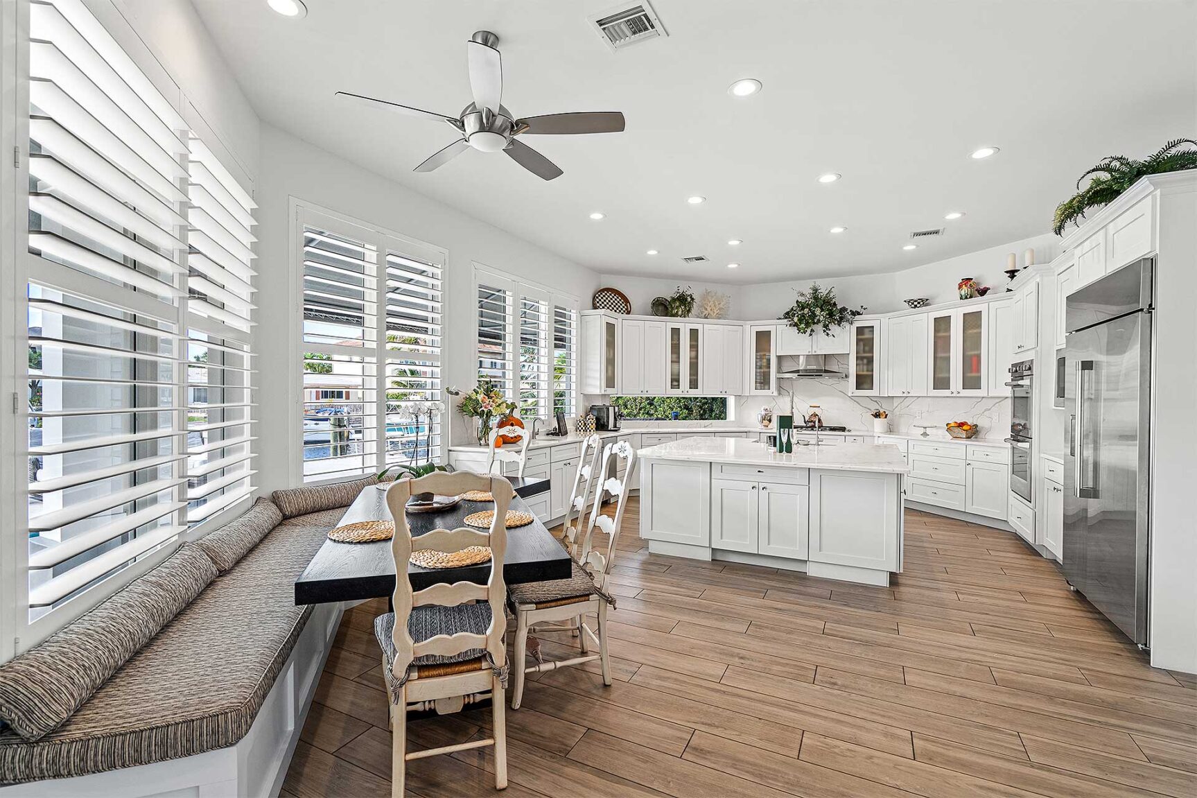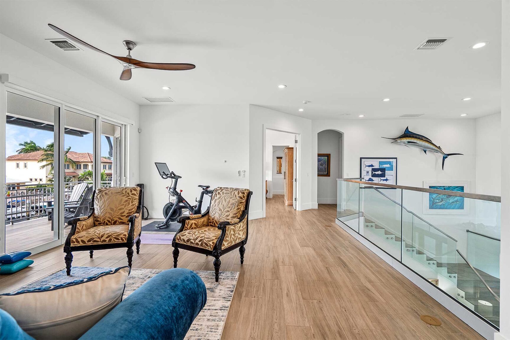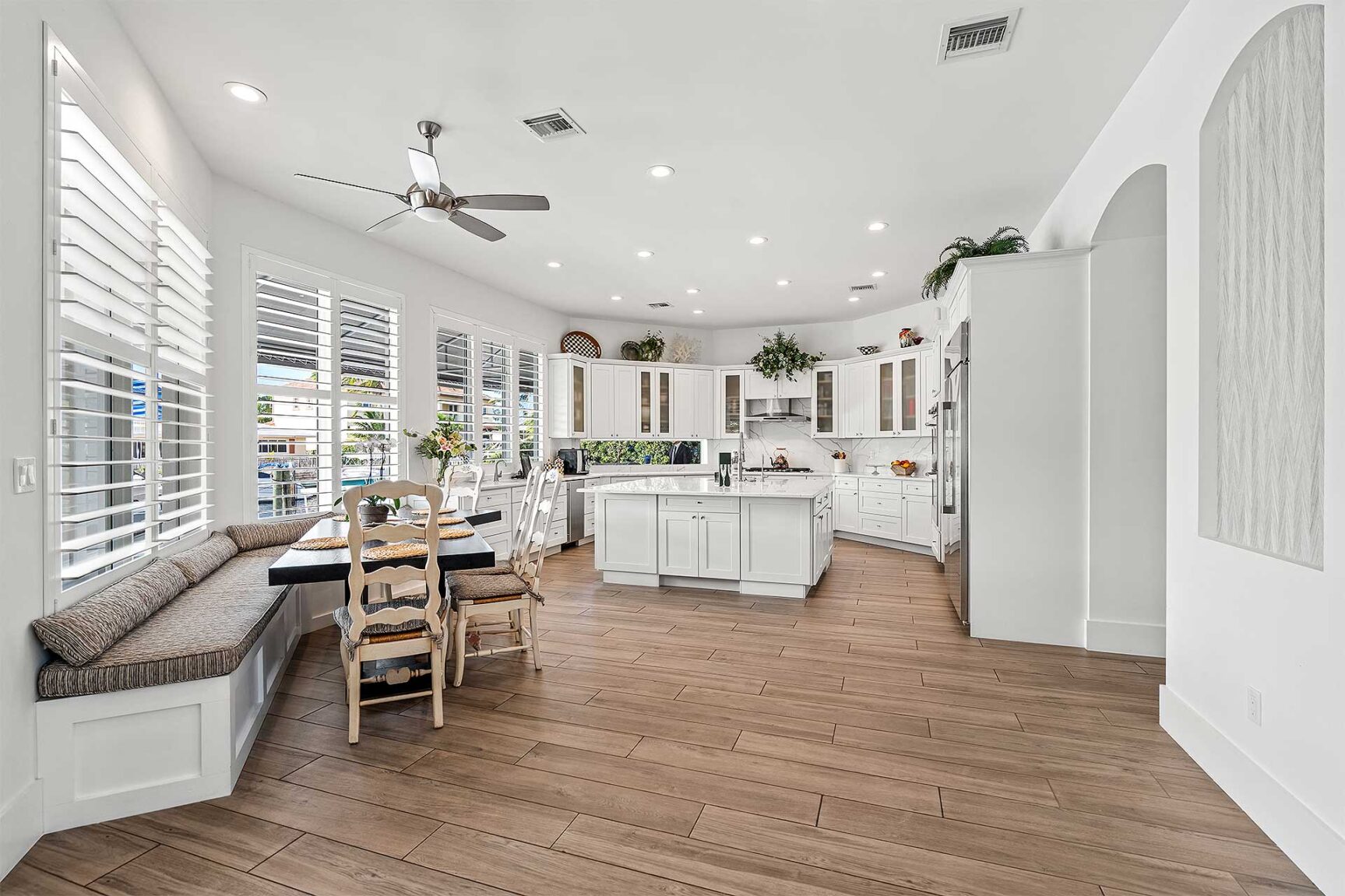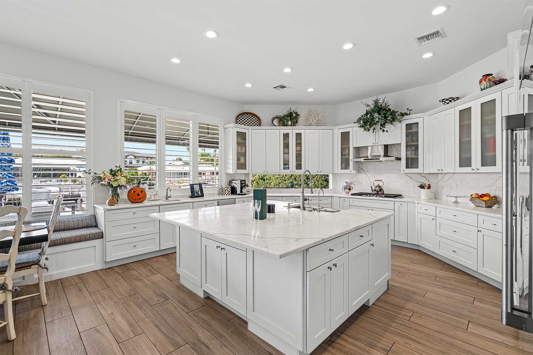 Coastal-inspired elegance defines the essence of this chic deepwater custom estate, one parcel off the Intracoastal with 85 feet of waterfrontage. Built in 2021 with six bedrooms and 5,512± total square feet, the grand two-story foyer, with a dramatic floating glass stairway, introduces the light-filled main living room with an inviting fireplace, along with a gracious dining area featuring a built-in serving buffet. In a seamless open-concept plan, the adjoining chef's island kitchen is finished with white Shaker-style cabinetry, quartz countertops, premium GE Monogram appliances and a breakfast nook with banquette seating. Fronted by window walls of impact glass and a set of French doors that open to the loggia, this entire living area overlooks the scenic waterway. First floor living is complete with two ensuite guest bedrooms, while upstairs, a loft area connects three ensuite guest bedrooms and the primary suit. Light, bright and tranquil, the primary bedroom is topped with a triple tray ceiling and features water-view impact-glass windows and a set of sliding doors that open to the balcony overlooking the pool and waterway. The suite comprises dual closets and a spa-like bathroom with dual sinks, a freestanding soaking tub and a glass-enclosed walk-in shower. Completing the overall layout are a cabana bath, laundry room and two-bay garage, with additional details that include porcelain-tile wood-look floors throughout and generator-ready accommodation.