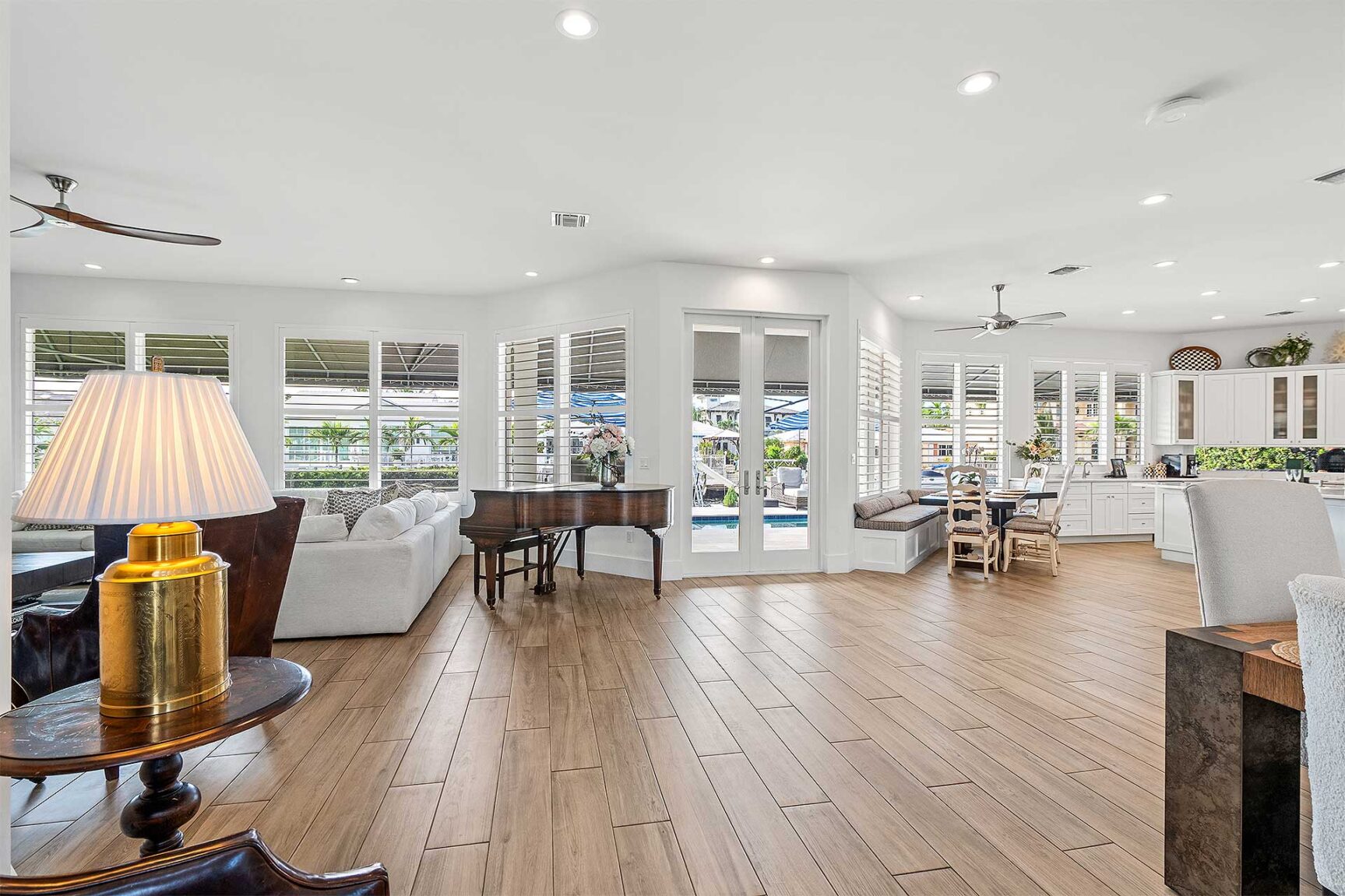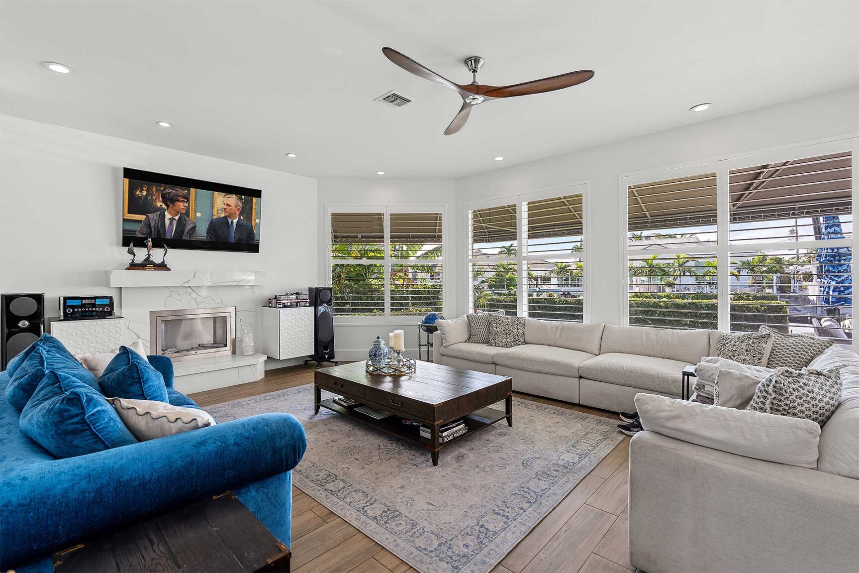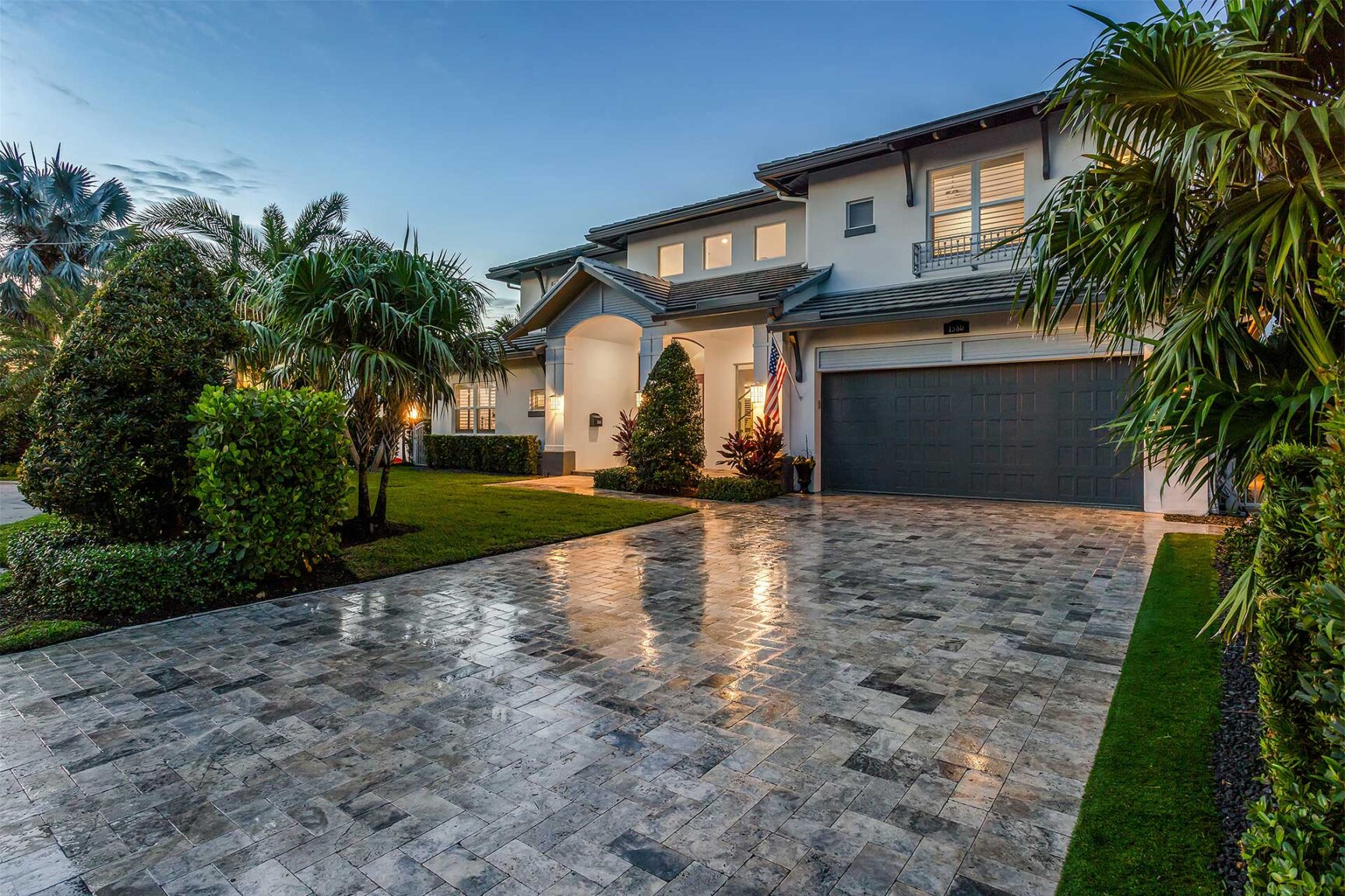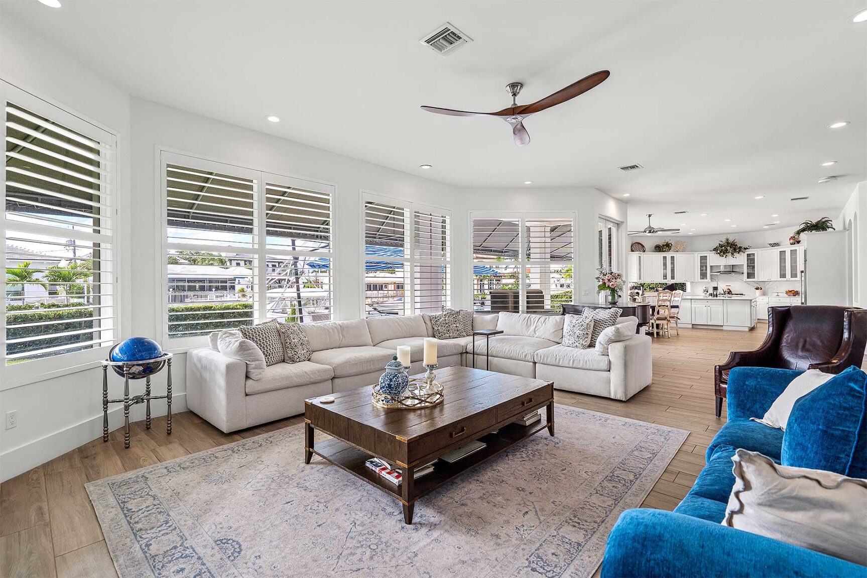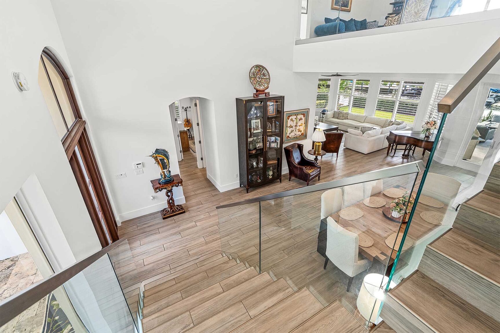 Coastal-inspired elegance defines the essence of this chic deepwater custom estate, one parcel off the Intracoastal with 85 feet of waterfrontage. Built in 2021 with six bedrooms and 5,512± total square feet, the grand two-story foyer, with a dramatic floating glass stairway, introduces the light-filled main living room with an inviting fireplace, along with a gracious dining area featuring a built-in serving buffet. In a seamless open-concept plan, the adjoining chef's island kitchen is finished with white Shaker-style cabinetry, quartz countertops, premium GE Monogram appliances and a breakfast nook with banquette seating. Fronted by window walls of impact glass and a set of French doors that open to the loggia, this entire living area overlooks the scenic waterway. First floor living is complete with two ensuite guest bedrooms, while upstairs, a loft area connects three ensuite guest bedrooms and the primary suit. Light, bright and tranquil, the primary bedroom is topped with a triple tray ceiling and features water-view impact-glass windows and a set of sliding doors that open to the balcony overlooking the pool and waterway. The suite comprises dual closets and a spa-like bathroom with dual sinks, a freestanding soaking tub and a glass-enclosed walk-in shower. Completing the overall layout are a cabana bath, laundry room and two-bay garage, with additional details that include porcelain-tile wood-look floors throughout and generator-ready accommodation.