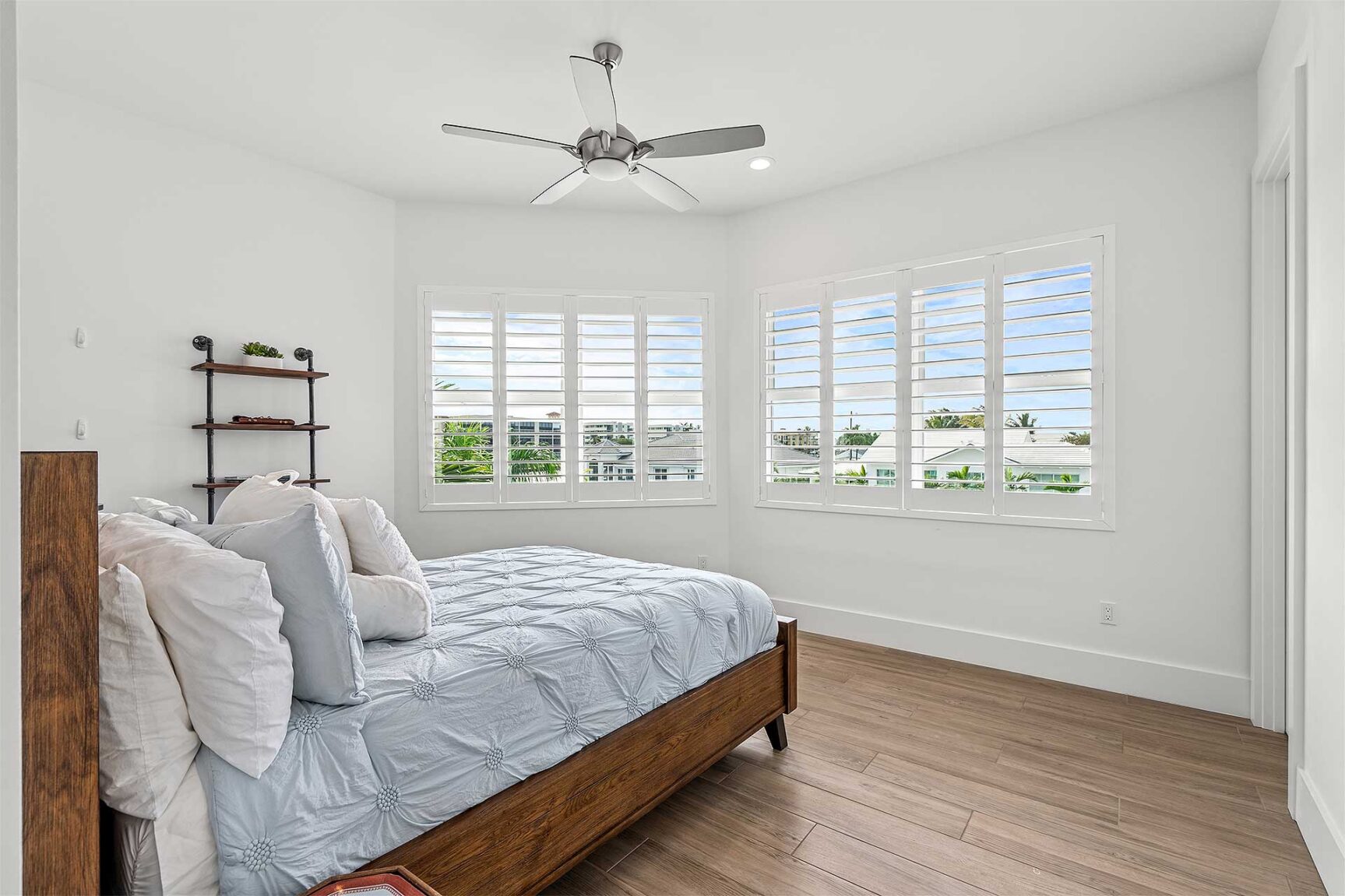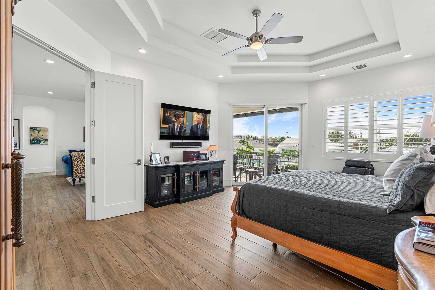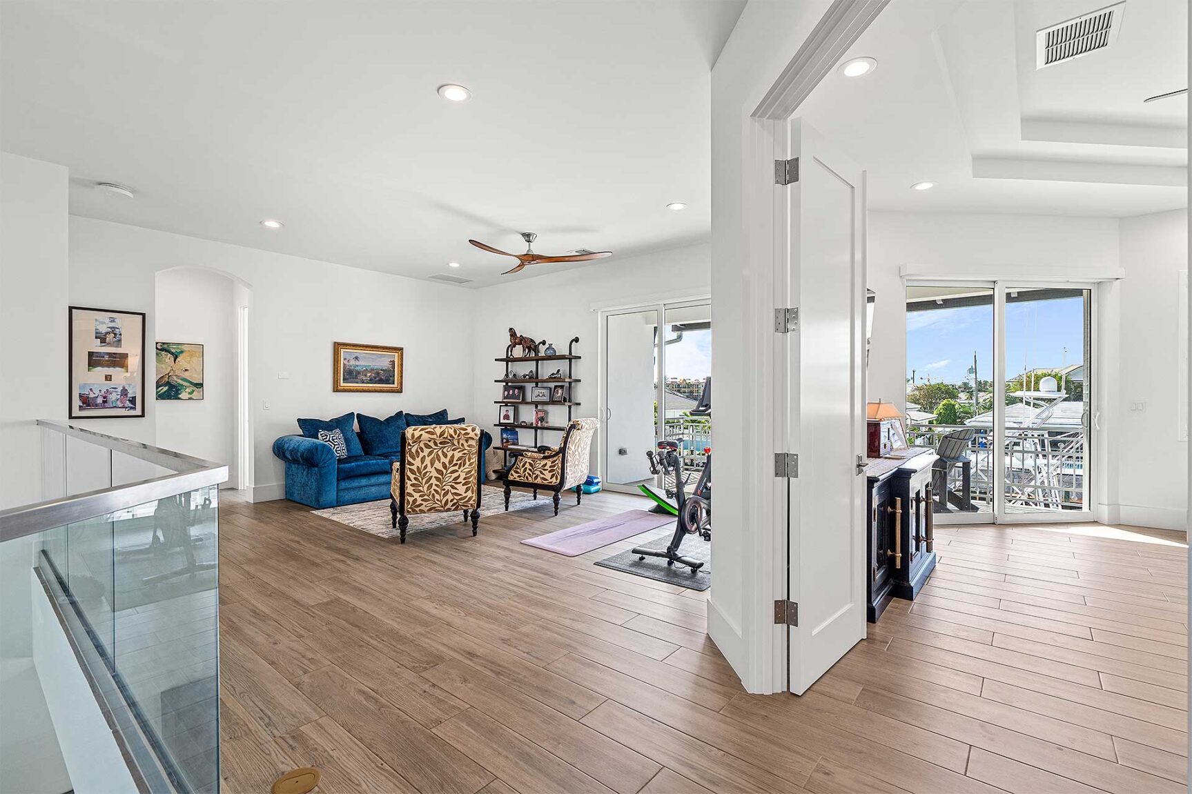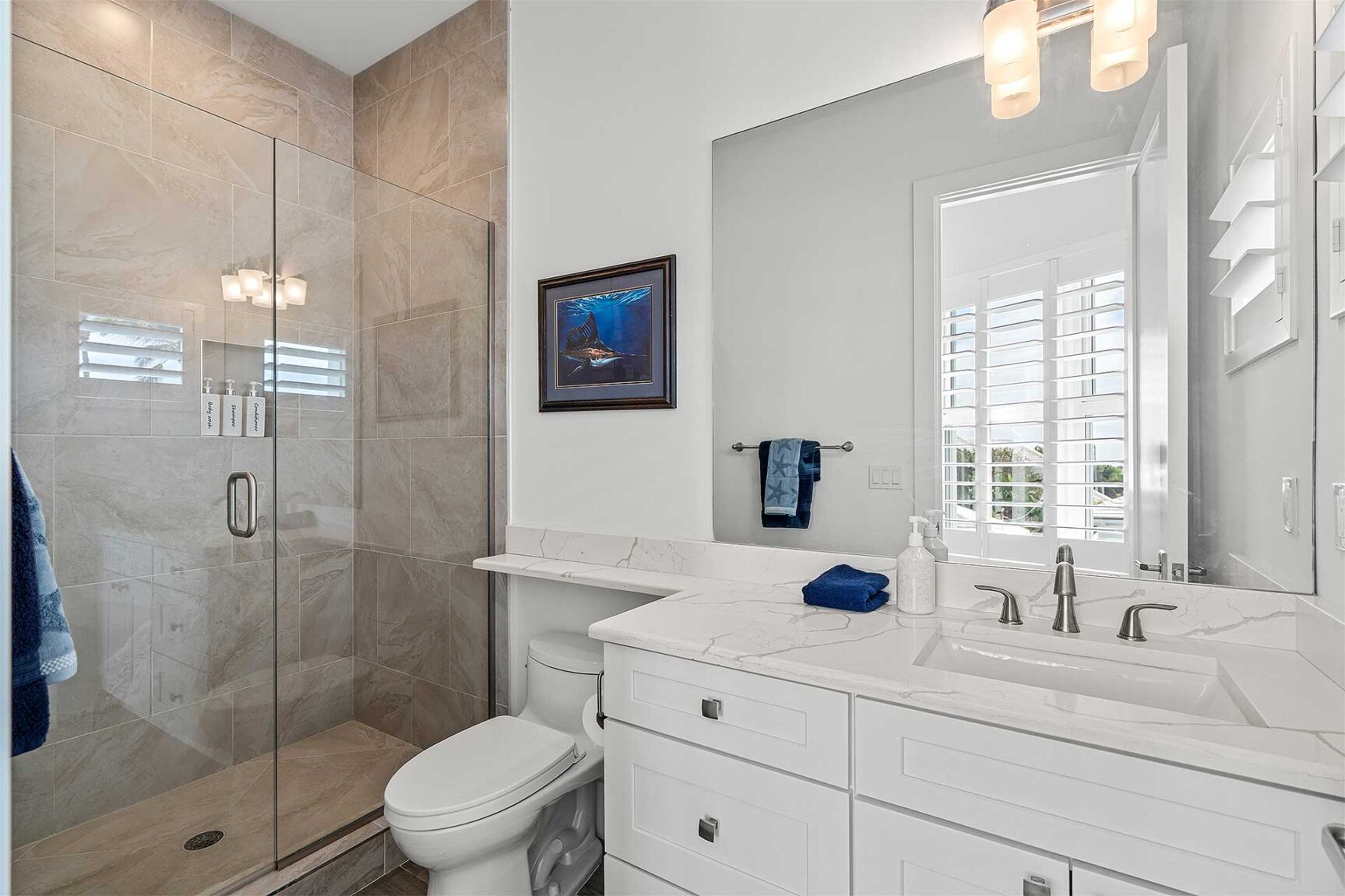 Coastal-inspired elegance defines the essence of this chic deepwater custom estate, one parcel off the Intracoastal with 85 feet of waterfrontage. Built in 2021 with six bedrooms and 5,512± total square feet, the grand two-story foyer, with a dramatic floating glass stairway, introduces the light-filled main living room with an inviting fireplace, along with a gracious dining area featuring a built-in serving buffet. In a seamless open-concept plan, the adjoining chef's island kitchen is finished with white Shaker-style cabinetry, quartz countertops, premium GE Monogram appliances and a breakfast nook with banquette seating. Fronted by window walls of impact glass and a set of French doors that open to the loggia, this entire living area overlooks the scenic waterway. First floor living is complete with two ensuite guest bedrooms, while upstairs, a loft area connects three ensuite guest bedrooms and the primary suit. Light, bright and tranquil, the primary bedroom is topped with a triple tray ceiling and features water-view impact-glass windows and a set of sliding doors that open to the balcony overlooking the pool and waterway. The suite comprises dual closets and a spa-like bathroom with dual sinks, a freestanding soaking tub and a glass-enclosed walk-in shower. Completing the overall layout are a cabana bath, laundry room and two-bay garage, with additional details that include porcelain-tile wood-look floors throughout and generator-ready accommodation.