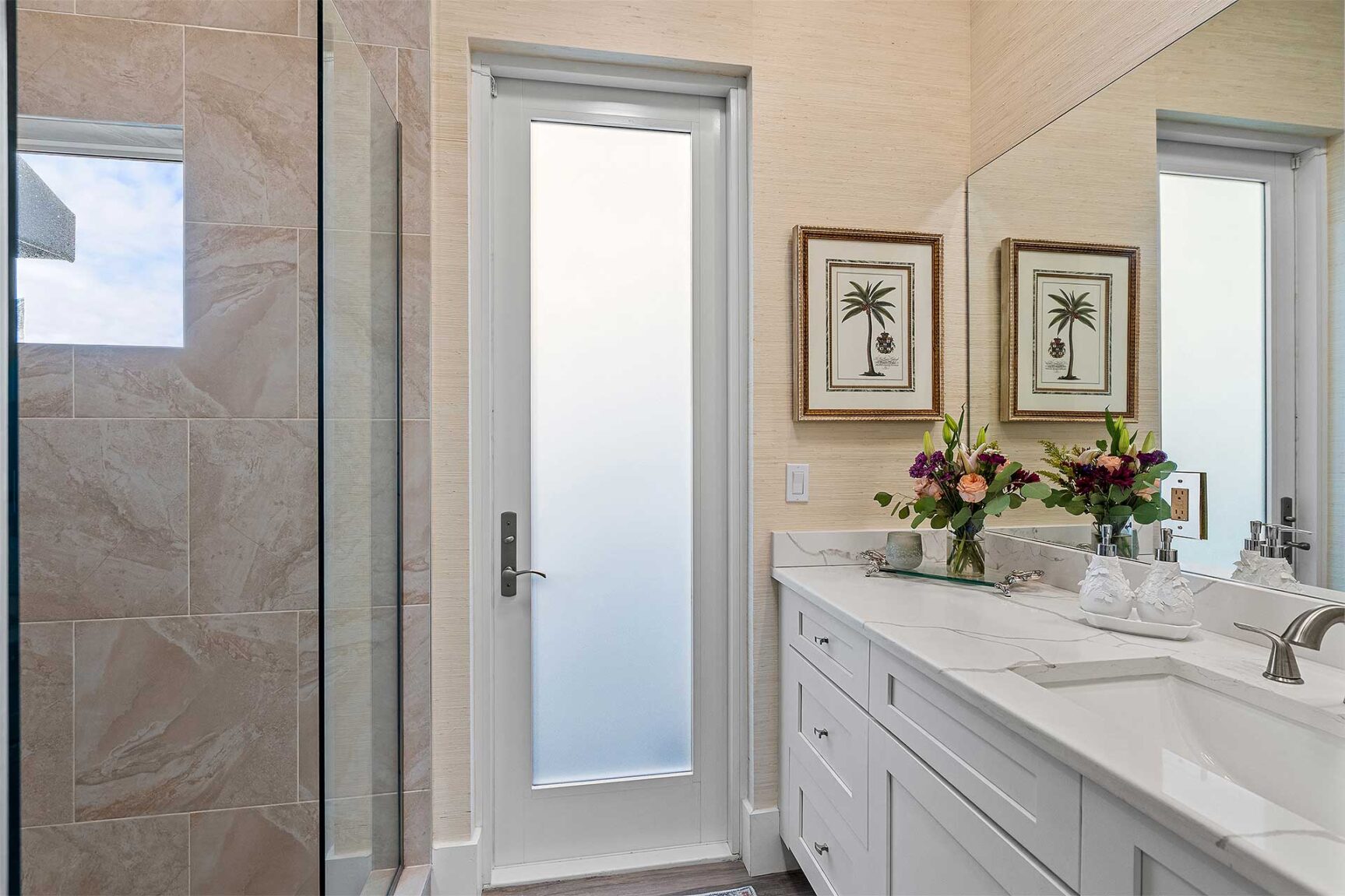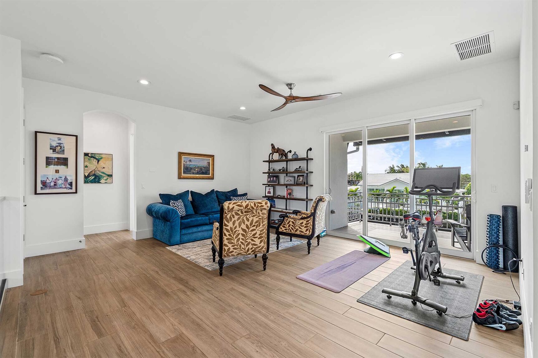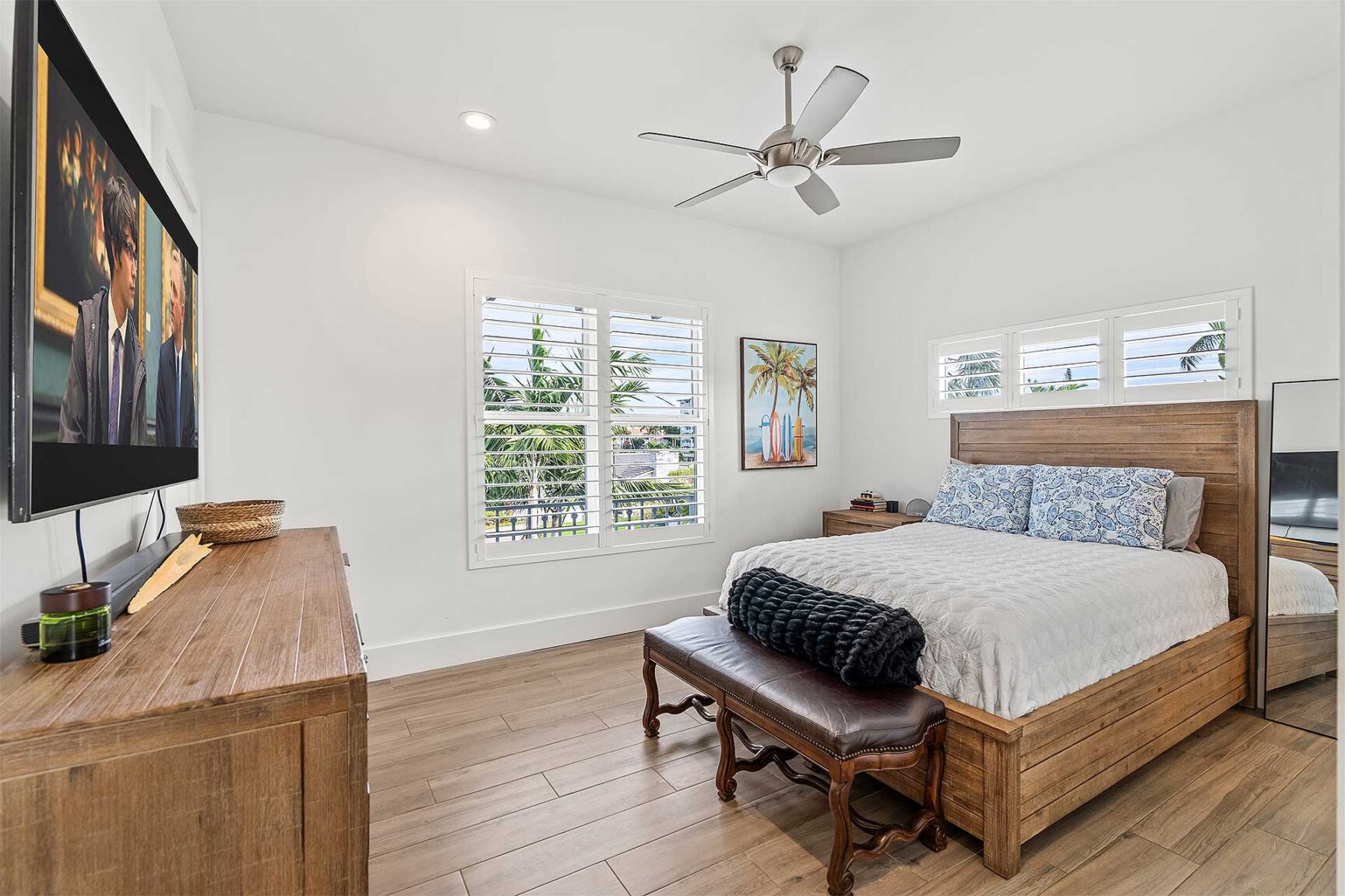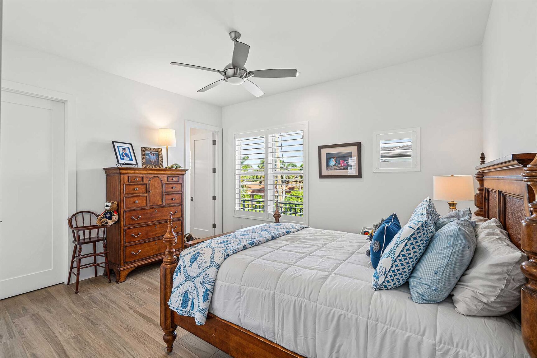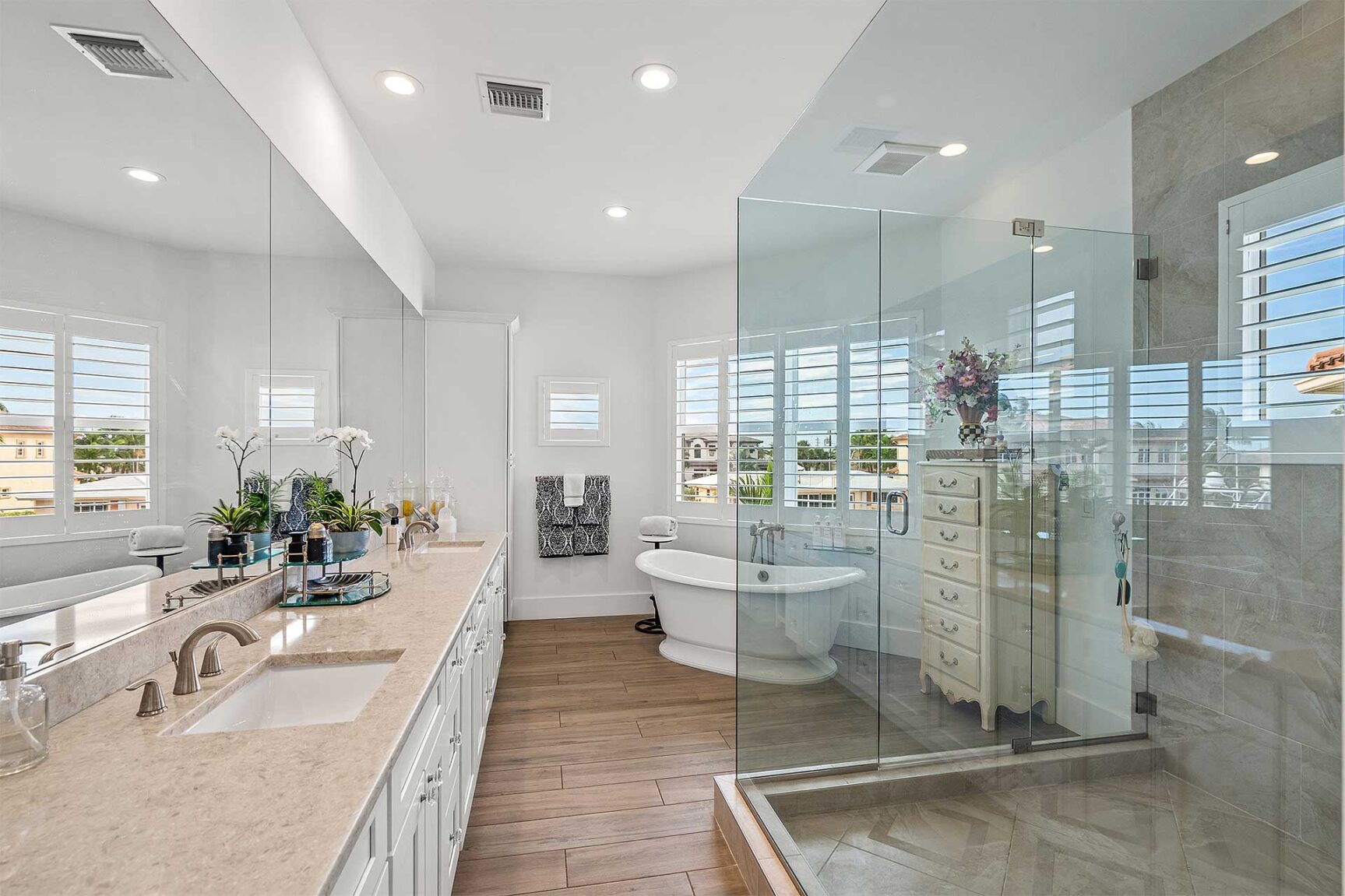 Coastal-inspired elegance defines the essence of this chic deepwater custom estate, one parcel off the Intracoastal with 85 feet of waterfrontage. Built in 2021 with six bedrooms and 5,512± total square feet, the grand two-story foyer, with a dramatic floating glass stairway, introduces the light-filled main living room with an inviting fireplace, along with a gracious dining area featuring a built-in serving buffet. In a seamless open-concept plan, the adjoining chef's island kitchen is finished with white Shaker-style cabinetry, quartz countertops, premium GE Monogram appliances and a breakfast nook with banquette seating. Fronted by window walls of impact glass and a set of French doors that open to the loggia, this entire living area overlooks the scenic waterway. First floor living is complete with two ensuite guest bedrooms, while upstairs, a loft area connects three ensuite guest bedrooms and the primary suit. Light, bright and tranquil, the primary bedroom is topped with a triple tray ceiling and features water-view impact-glass windows and a set of sliding doors that open to the balcony overlooking the pool and waterway. The suite comprises dual closets and a spa-like bathroom with dual sinks, a freestanding soaking tub and a glass-enclosed walk-in shower. Completing the overall layout are a cabana bath, laundry room and two-bay garage, with additional details that include porcelain-tile wood-look floors throughout and generator-ready accommodation.