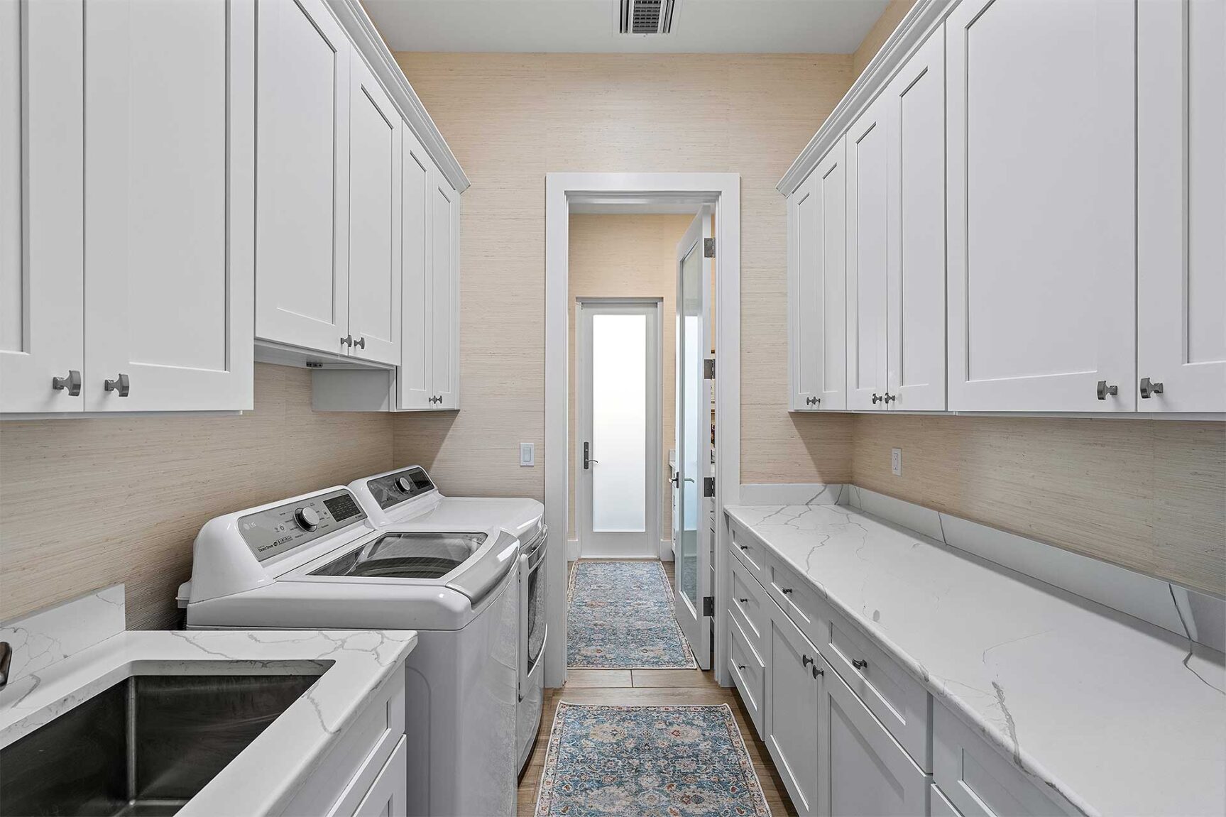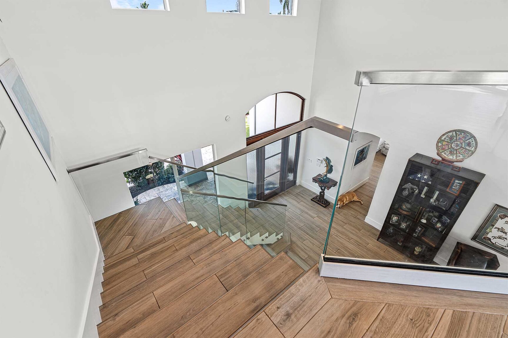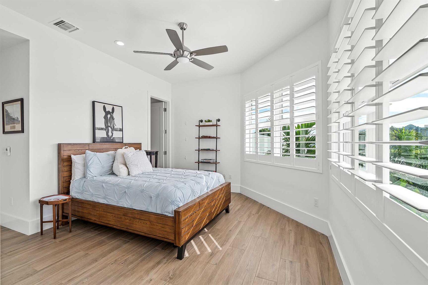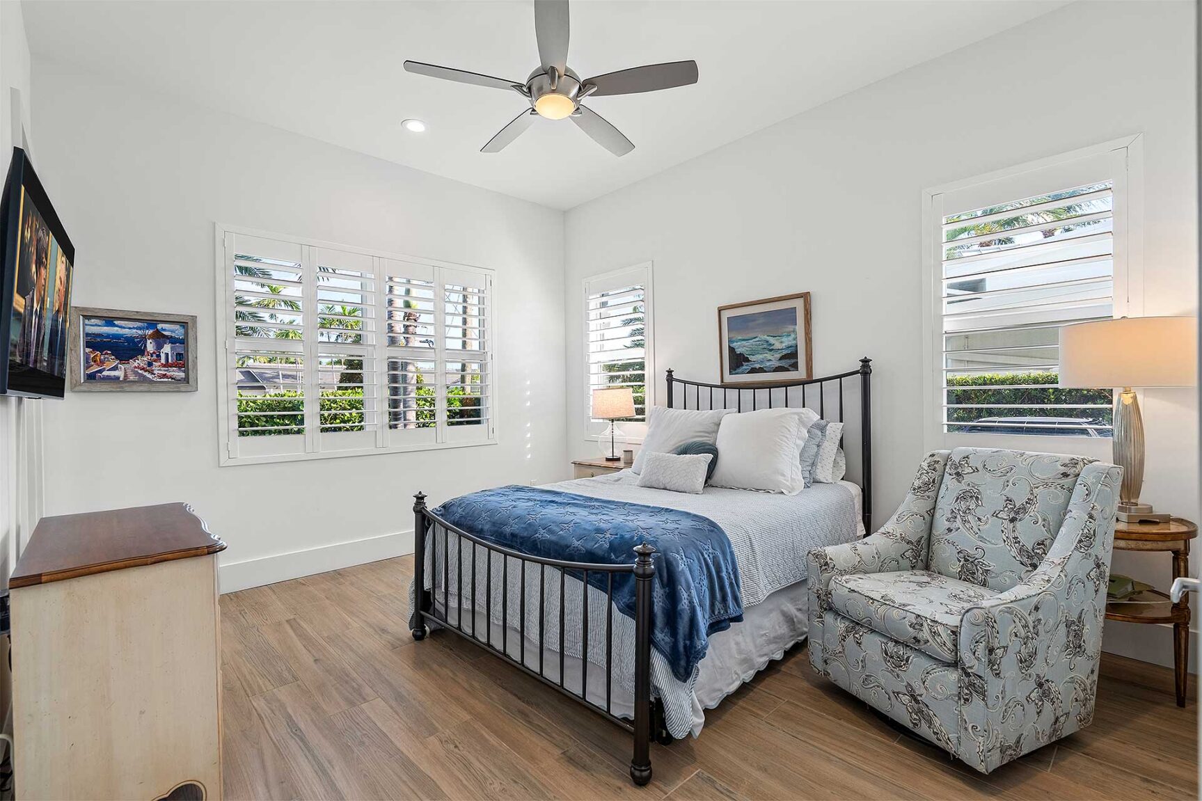 Coastal-inspired elegance defines the essence of this chic deepwater custom estate, one parcel off the Intracoastal with 85 feet of waterfrontage. Built in 2021 with six bedrooms and 5,512± total square feet, the grand two-story foyer, with a dramatic floating glass stairway, introduces the light-filled main living room with an inviting fireplace, along with a gracious dining area featuring a built-in serving buffet. In a seamless open-concept plan, the adjoining chef's island kitchen is finished with white Shaker-style cabinetry, quartz countertops, premium GE Monogram appliances and a breakfast nook with banquette seating. Fronted by window walls of impact glass and a set of French doors that open to the loggia, this entire living area overlooks the scenic waterway. First floor living is complete with two ensuite guest bedrooms, while upstairs, a loft area connects three ensuite guest bedrooms and the primary suit. Light, bright and tranquil, the primary bedroom is topped with a triple tray ceiling and features water-view impact-glass windows and a set of sliding doors that open to the balcony overlooking the pool and waterway. The suite comprises dual closets and a spa-like bathroom with dual sinks, a freestanding soaking tub and a glass-enclosed walk-in shower. Completing the overall layout are a cabana bath, laundry room and two-bay garage, with additional details that include porcelain-tile wood-look floors throughout and generator-ready accommodation.