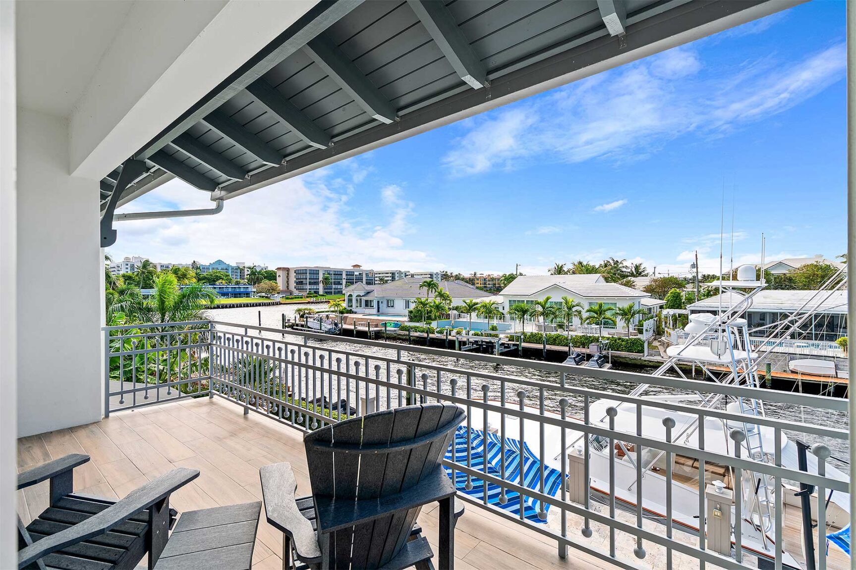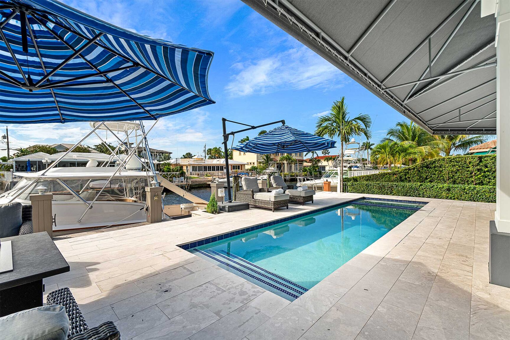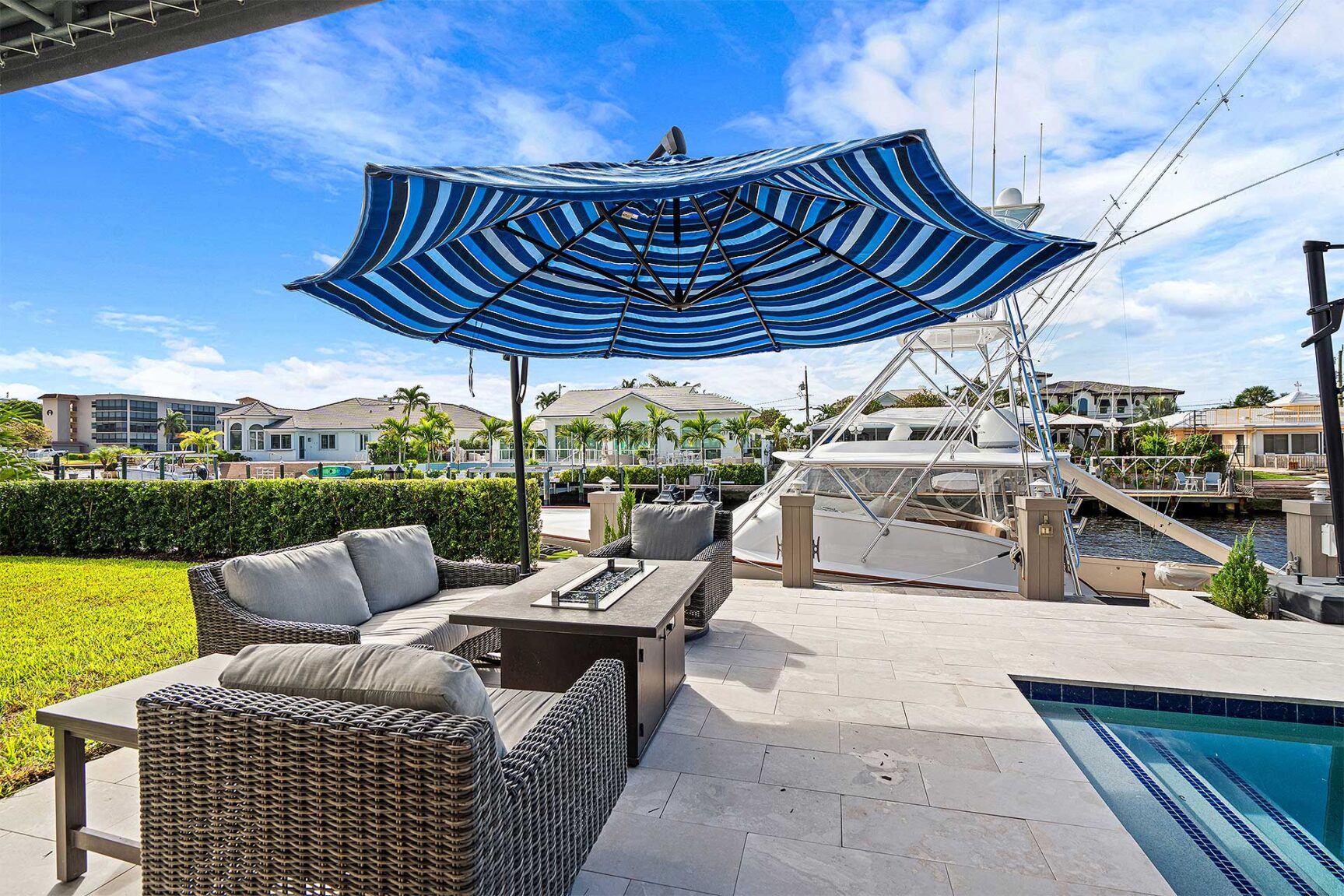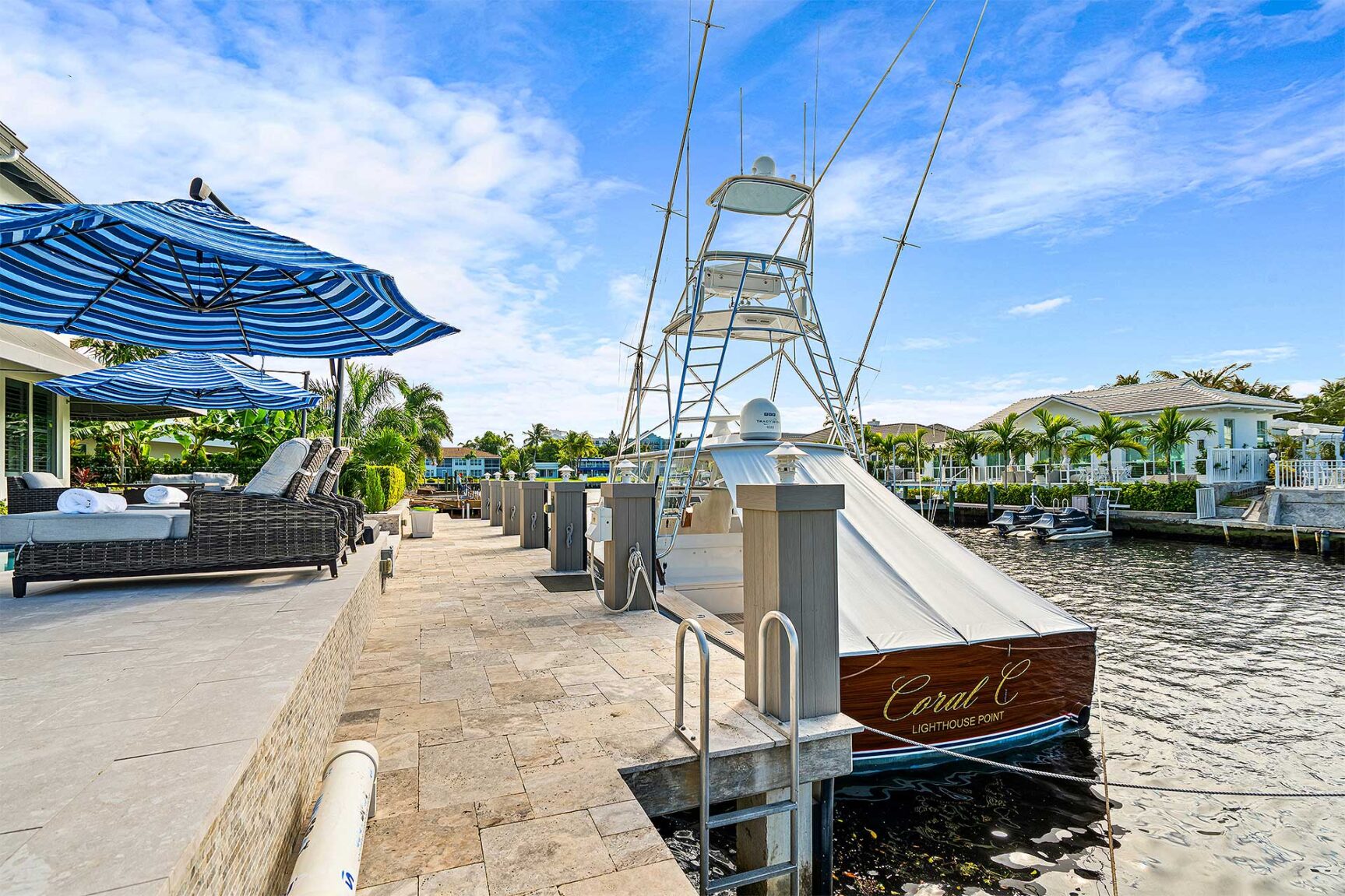 On a canal directly off the Intracoastal Waterway, a paved driveway circles around a landscaped oasis creating a dramatic approach, while outdoor entertaining awaits on the covered loggia that flows out to the sun-splashed, heated, saltwater pool with a spillover spa set within a stone-paved patio. Offering 85± feet of deepwater frontage and a 60-foot full-service concrete dock, boating enthusiasts appreciate no-fixed-bridges easy access to the ocean through both the Boca and Hillsboro Inlets.