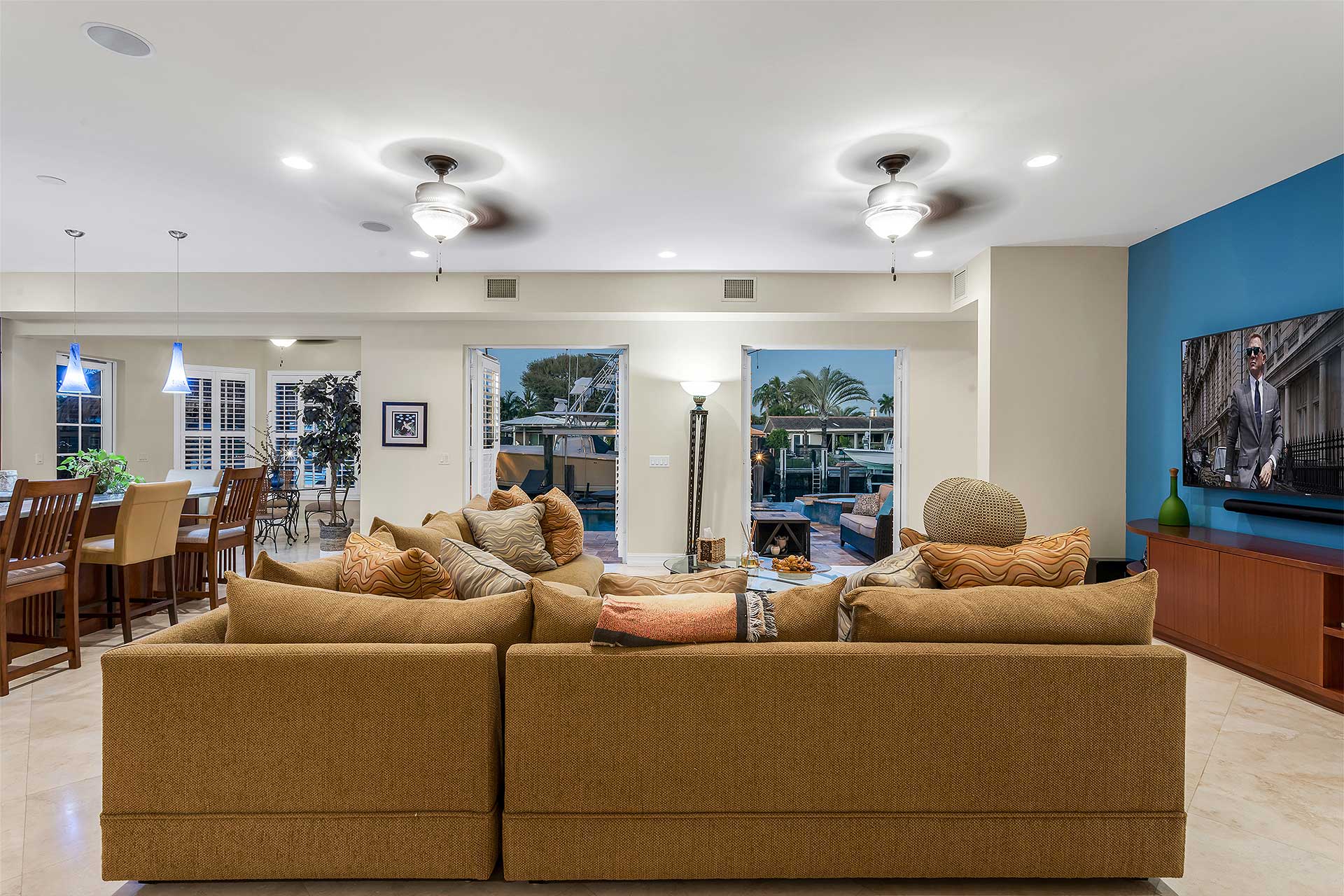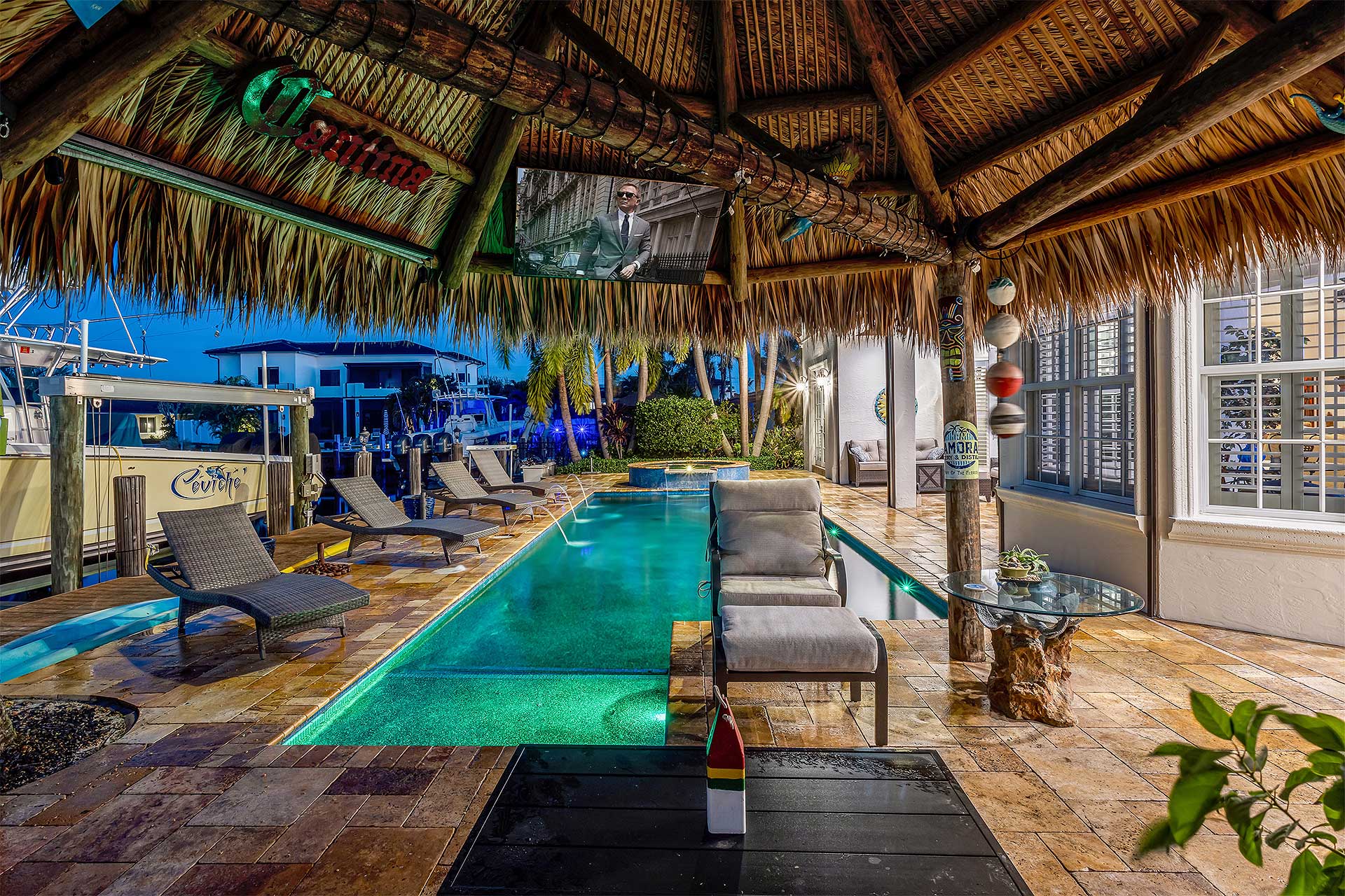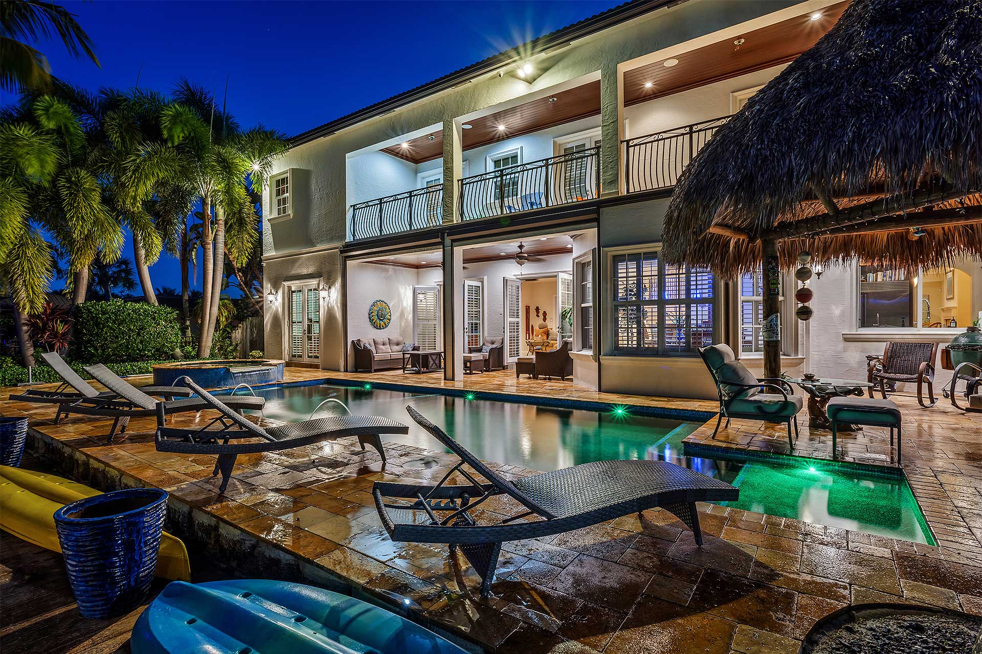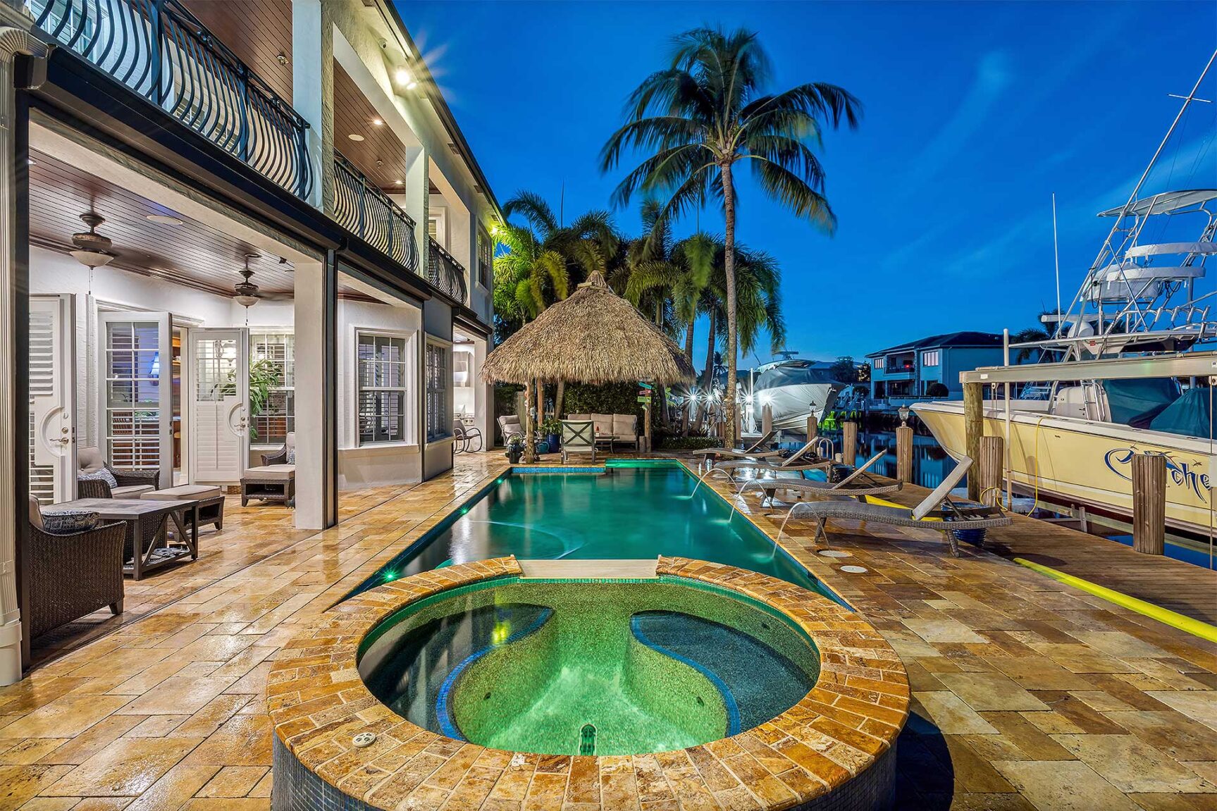 Exceptional Mediterranean deepwater estate sited on 80’ of waterfrontage, offering 6 bedrooms, 6.1 baths and 5,546±SqFt of refined living. Light-filled interiors feature a flexible floorplan with both upper- and lower-level living, including asecond-level primary suite with private sitting area, fireplace and expansive waterfront balcony. The custom kitchenshowcases quartzite countertops, Wolf gas cooktop, custom cabinetry, and is complemented by a waterfront breakfast nookand wet bar. Additional features include impact windows and doors, new paint, elevator, and 3-bay garage. Outdoor livingis enjoyed on a marble-pavered patio with covered loggias, refinished heated pool with spill-over spa, custom tiki hut, anda 70’ composite yacht dock just minutes to the Hillsboro Inlet.
